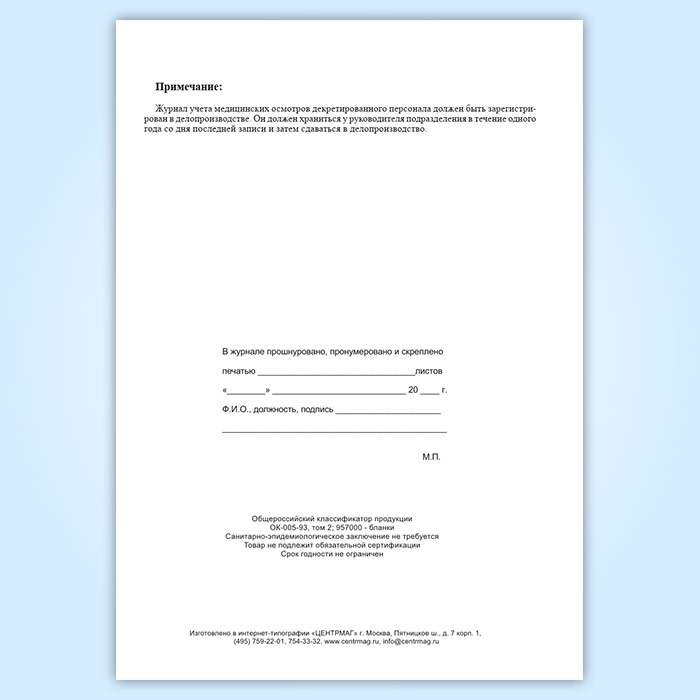 Журнал учета медицинских осмотров декретированного персонала в Ачинске купить