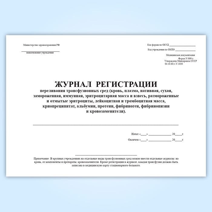 Журнал регистрации переливания трансфузионных сред (форма 009/у) в Ачинске купить