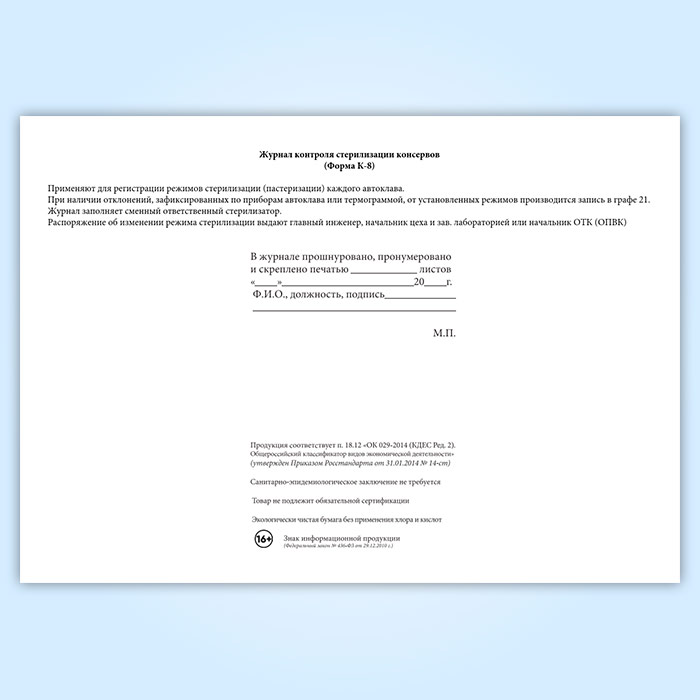 Журнал контроля стерилизации консервов (форма К-8) в Ачинске купить