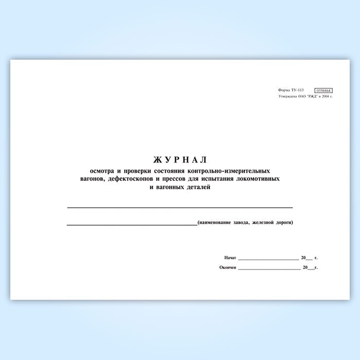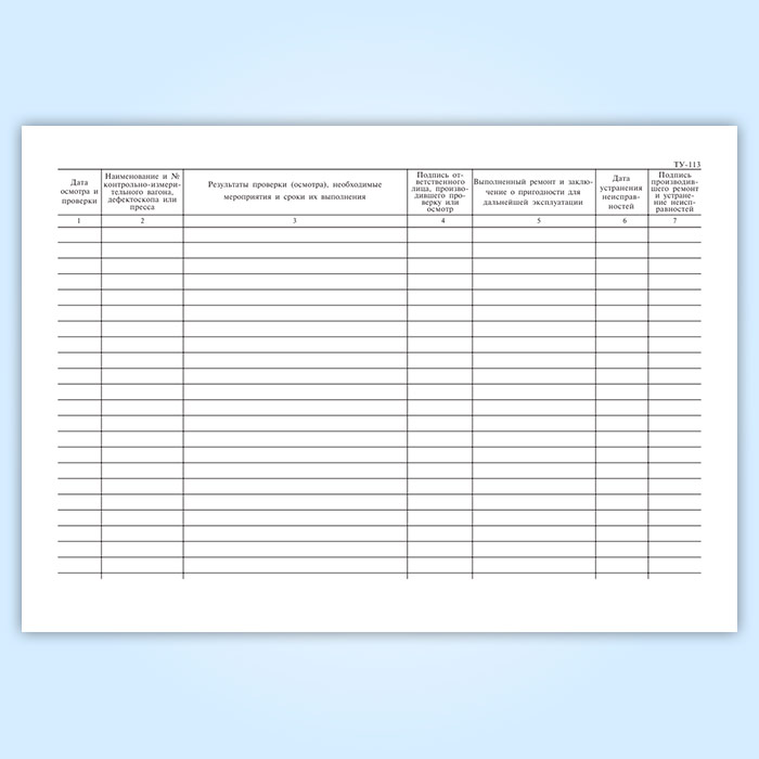 Журнал осмотра и проверки состояния контрольно-измерительных вагонов, дефектоскопов и прессов для испытания локомотивных и вагонных деталей (форма ТУ-113) в Ачинске купить