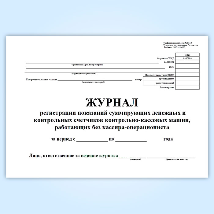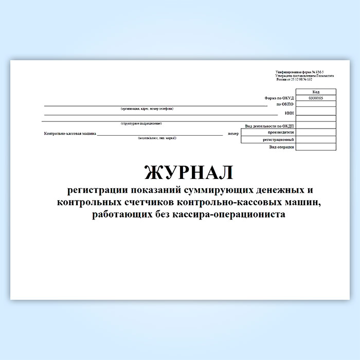 Журнал регистрации показаний суммирующих денежных и контрольных счетчиков контрольно-кассовых машин, работающих без кассира-операциониста (форма КМ-5) в Ачинске купить