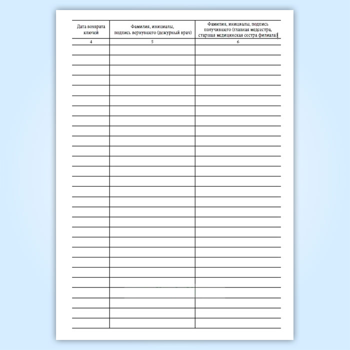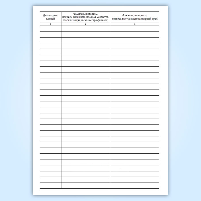 Журнал передачи ключей главной медсестры (старшей медицинской сестры филиала) дежурным врачам от помещения и сейфа, где проводятся операции, связанные с оборотом наркотических средств и психотропных веществ, в выходные и праздничные дни в амбулаторном отделении медицинской организации в Ачинске купить
