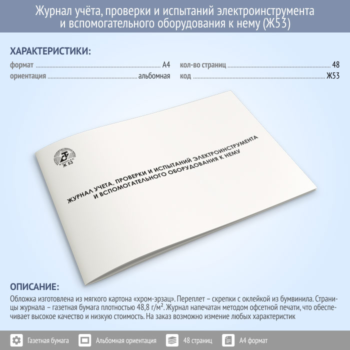Журнал учета, проверки и испытаний электроинструмента и вспомогательного оборудования к нему (48 стр., Ж53) в Ачинске купить
