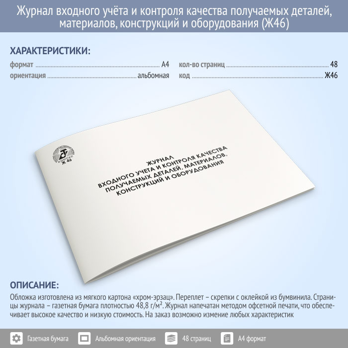 Журнал входного учета и контроля качества получаемых деталей, материалов, конструкций и оборудования (48 стр., Ж46) в Ачинске купить