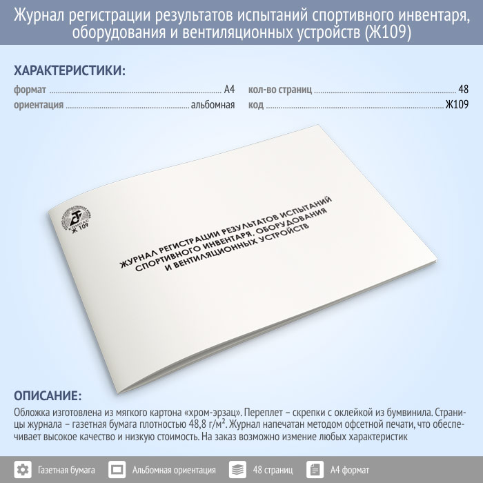Журнал регистрации результатов испытаний спортивного инвентаря, оборудования и вентиляционных устройств (48 стр., Ж109) в Ачинске купить