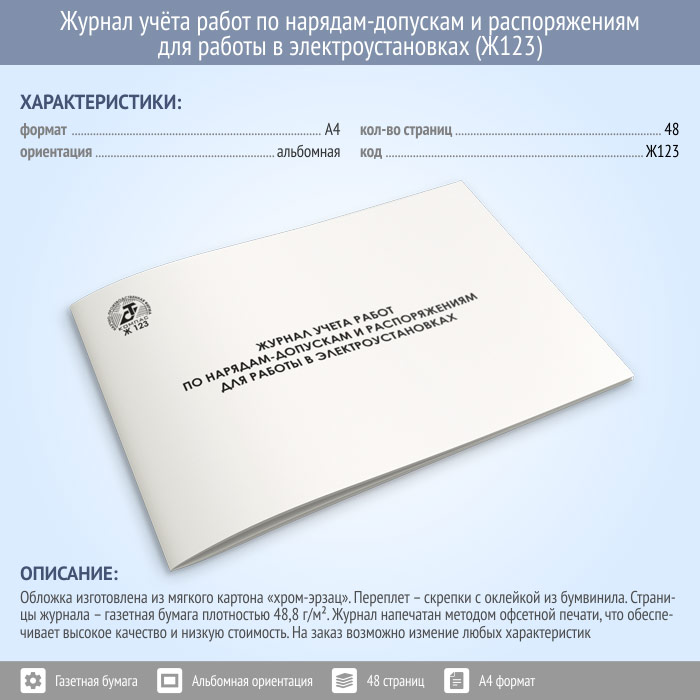 Журнал учета работ по нарядам-допускам и распоряжениям для работы в электроустановках (48 стр., Ж123) в Ачинске купить