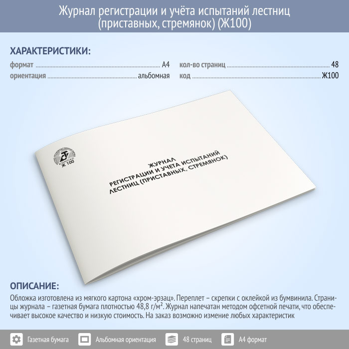 Журнал регистрации и учета испытаний лестниц (приставных, стремянок) (48 стр., Ж100) в Ачинске купить