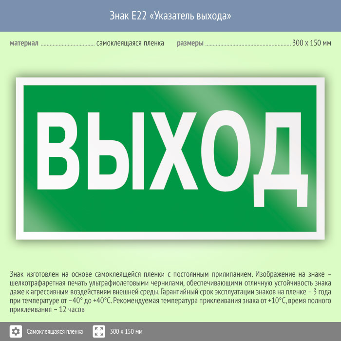 Знак «Указатель выхода» может быть изготовлен любого размера на самоклеящейся пленке, пластике толщиной 0.5, 2 или 4 мм и металле. Также возможно применение фотолюминесцентных и световозвращающих материалов