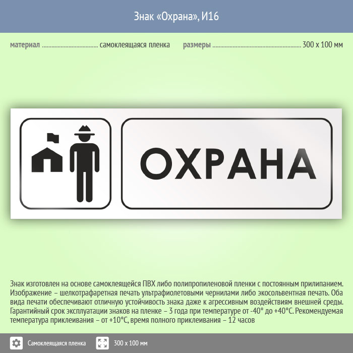 Знак «Охрана» может быть изготовлен любого размера на самоклеящейся пленке, пластике толщиной 0.5, 2 или 4 мм и металле. Также возможно применение фотолюминесцентных и световозвращающих материалов
