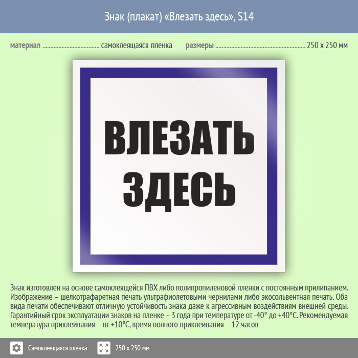 Знак «Влезать здесь» может быть изготовлен любого размера на самоклеящейся пленке, пластике толщиной 0.5, 2 или 4 мм и металле. Также возможно применение фотолюминесцентных и световозвращающих материалов