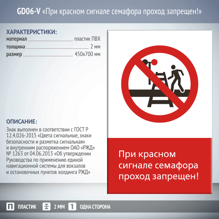 Знак безопасности «При красном сигнале семафора проход запрещен!» выполняется в одностороннем (металл и пластик) и двустороннем (только металл) виде, на ПВХ-пластике, толщиной 2 мм или листе оцинкованного металла, толщиной 0,8 мм. Размеры знаков - 450 мм х 700 мм (вертикальная ориентация) либо 540 мм х 220 мм (горизонтальная ориентация). Знаки изготавливаются в полном соответствии с ГОСТ Р 12.4.026-2015 «Цвета сигнальные, знаки безопасности и разметка сигнальная» и внутренним распоряжением ОАО «РЖД» № 1263 от 04.06.2013 «Об утверждении Руководства по применению единой навигационной системы для вокзалов и остановочных пунктов холдинга РЖД». По желанию заказчика возможно использование светоотражающих материалов. Так же при необходимости производим закругление углов знака