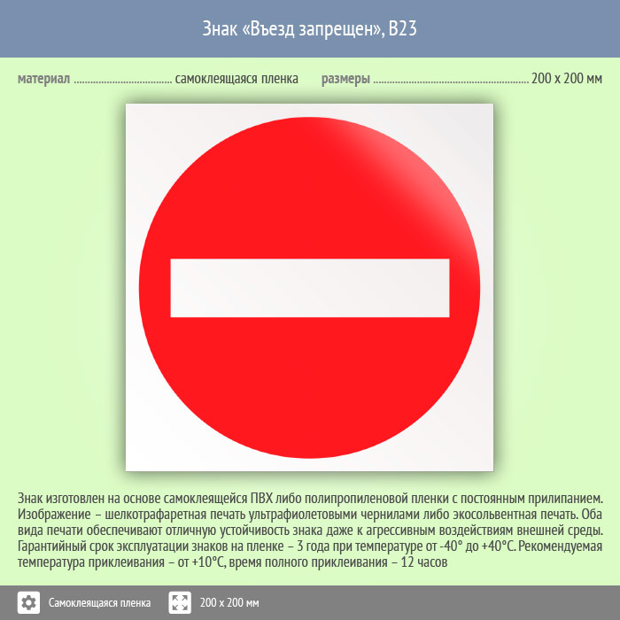 Знак «Въезд запрещен» имеет размер 200х200 мм