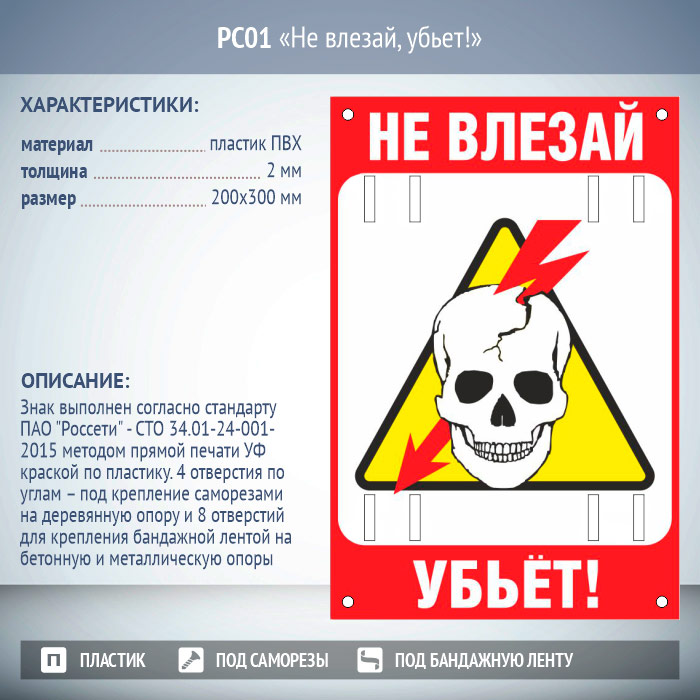Знак «Не влезай, убьет!», РС01 (пластик 2 мм, 200х300 мм, отверстия под бандажную ленту) в Ачинске купить
