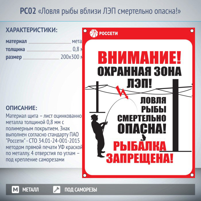 Знак «Ловля рыбы вблизи ЛЭП смертельно опасна!», РС02 (металл, 200х300 мм, отверстия под саморезы) в Ачинске купить