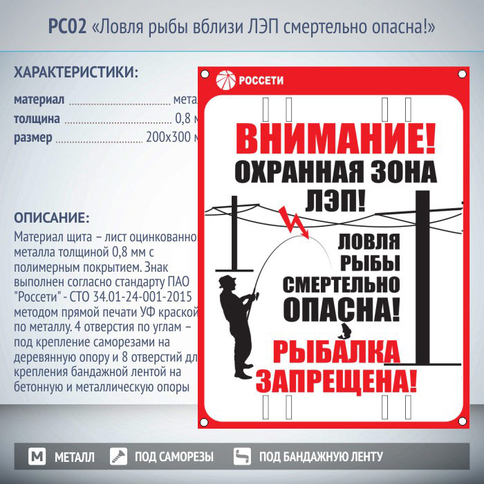 Знак «Ловля рыбы вблизи ЛЭП смертельно опасна!», РС02 (металл, 200х300 мм, отверстия под бандажную ленту) в Ачинске купить