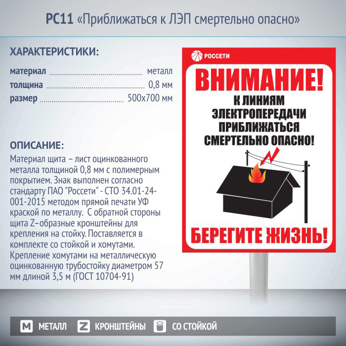 Информационный щит «Приближаться к ЛЭП смертельно опасно», РС11 (металл, 500х700 мм, с металлической стойкой) в Ачинске купить