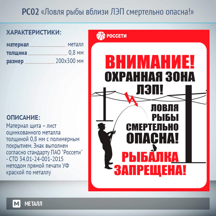 Знак «Ловля рыбы вблизи ЛЭП смертельно опасна!», РС02 (металл, 200х300 мм) в Ачинске купить