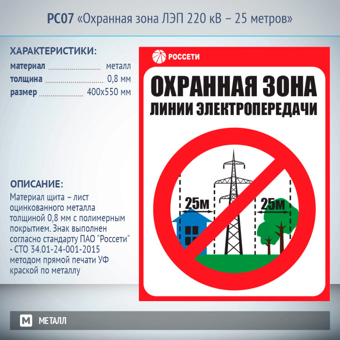 Знак «Охранная зона ЛЭП 220 кВ – 25 метров», РС07 (металл, 400х550 мм) в Ачинске купить