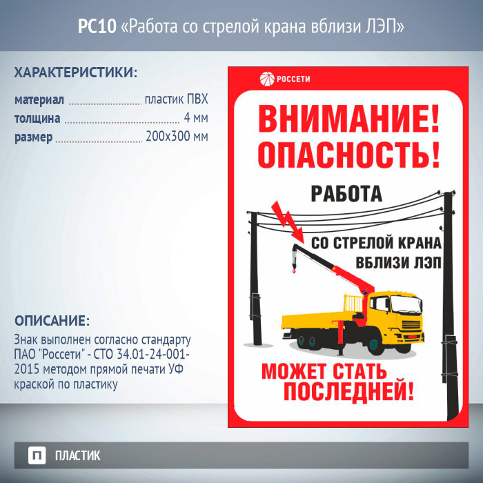Знак «Работа со стрелой крана вблизи ЛЭП», РС10 (пластик 2 мм, 200х300 мм) в Ачинске купить