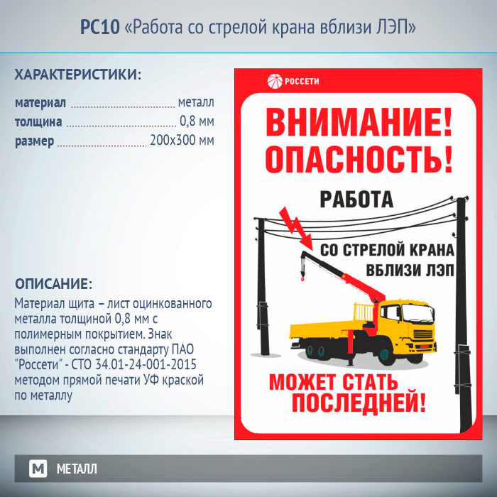 Знак «Работа со стрелой крана вблизи ЛЭП», РС10 (металл, 200х300 мм) в Ачинске купить