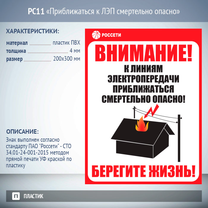 Знак «Приближаться к ЛЭП смертельно опасно», РС11 (пластик 2 мм, 200х300 мм) в Ачинске купить