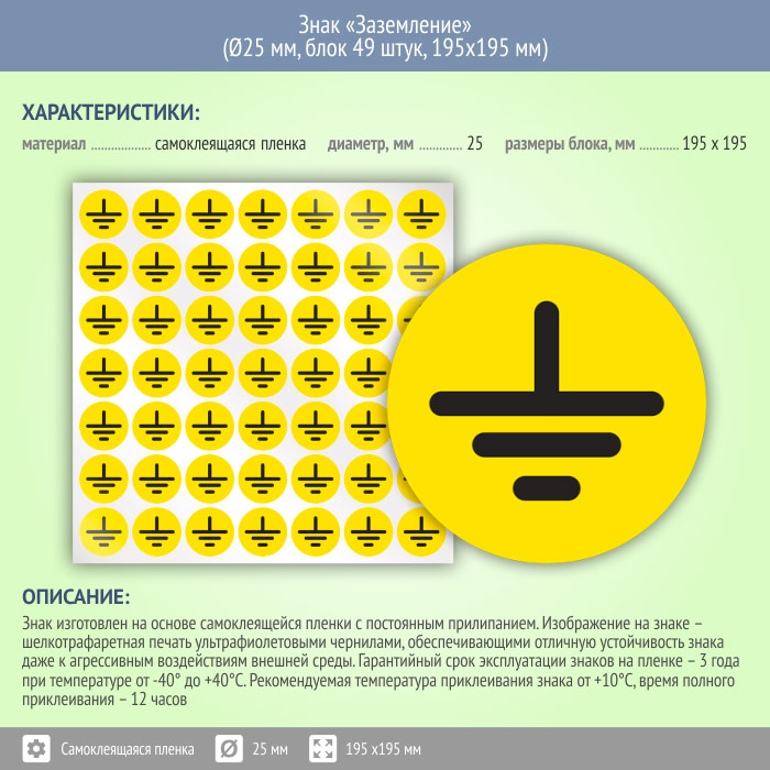 Знак (плакат) «Заземление», S46 (пленка, диаметр 25 мм, блок 49 штук, 195х195 мм) в Ачинске купить