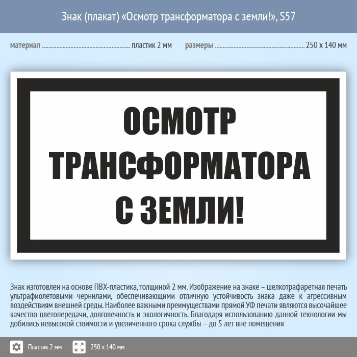 Знак (плакат) «Осмотр трансформатора с земли!», S57 (пластик, 250х140 мм) в Ачинске купить