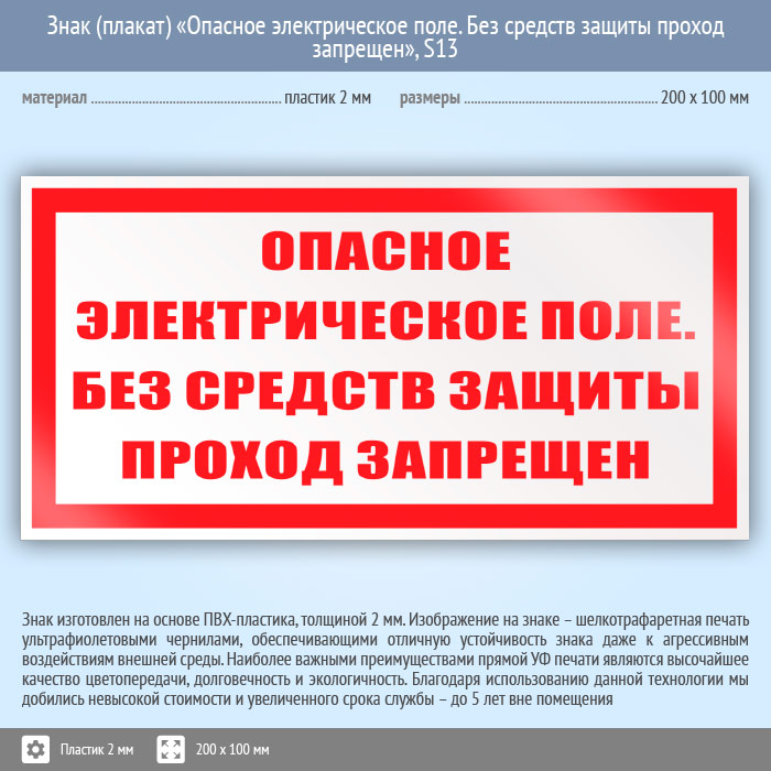 Знак (плакат) «Опасное электрическое поле. Без средств защиты проход запрещен», S13 (пластик, 200х100 мм) в Ачинске купить
