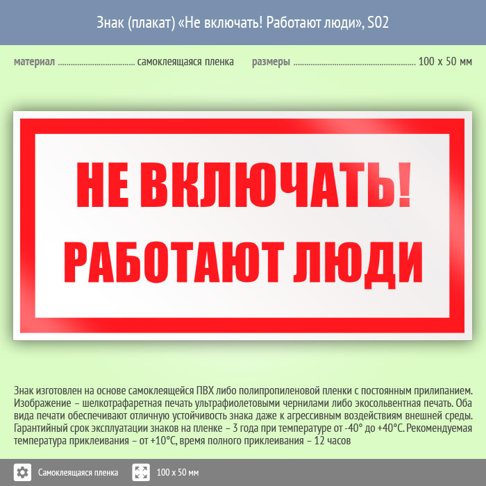 Знак (плакат) «Не включать! Работают люди», S02 (пленка, 100х50 мм) в Ачинске купить