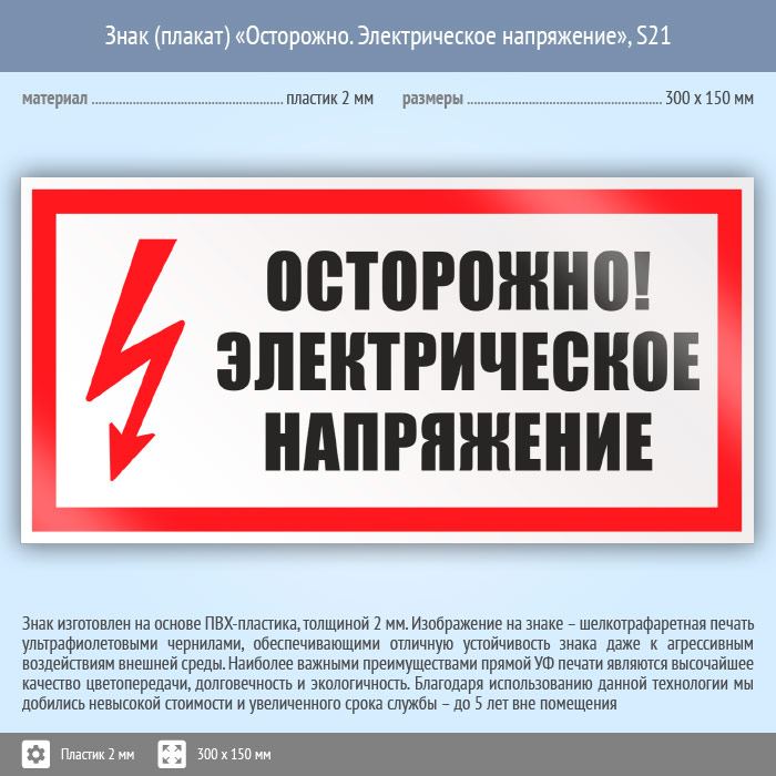 Знак (плакат) «Осторожно. Электрическое напряжение», S21 (пластик, 300х150 мм) в Ачинске купить