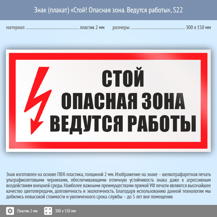 Знак (плакат) «Стой! Опасная зона. Ведутся работы», S22 (пластик, 300х150 мм) в Ачинске купить