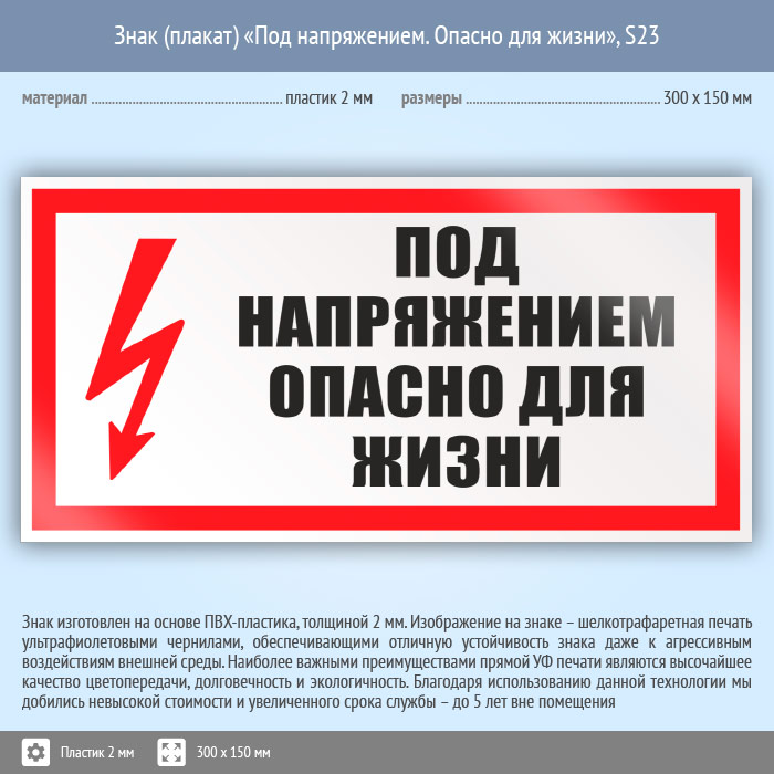 Знак (плакат) «Под напряжением. Опасно для жизни», S23 (пластик, 300х150 мм) в Ачинске купить