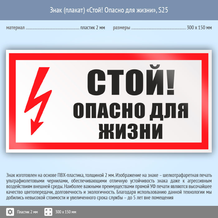 Знак (плакат) «Стой! Опасно для жизни», S25 (пластик, 300х150 мм) в Ачинске купить