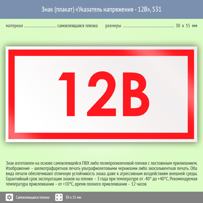 Знак (плакат) «Указатель напряжения 12 В», S31 (50 штук, пленка, 30х15 мм) в Ачинске купить