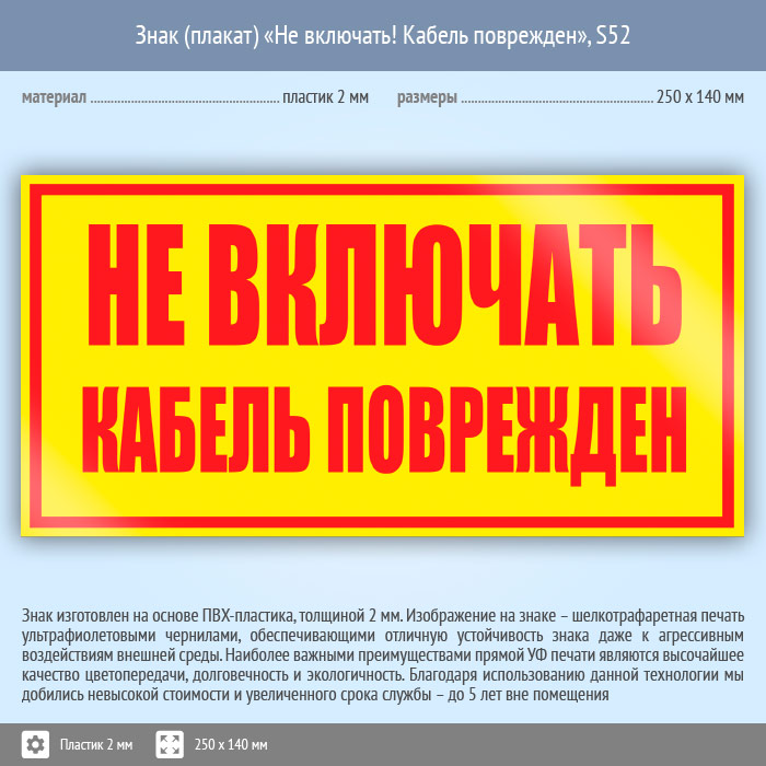 Знак (плакат) «Не включать! Кабель поврежден», S52 (пластик, 250х140 мм) в Ачинске купить
