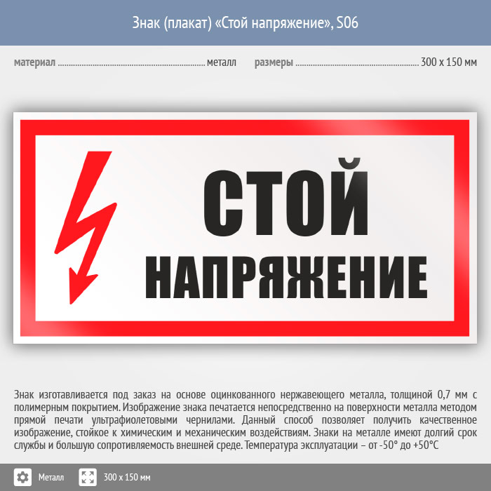 Знак (плакат) «Стой напряжение», S06 (металл, 300х150 мм) в Ачинске купить