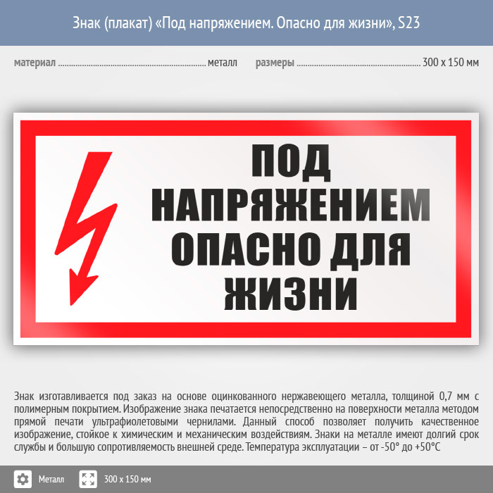 Знак (плакат) «Под напряжением. Опасно для жизни», S23 (металл, 300х150 мм) в Ачинске купить