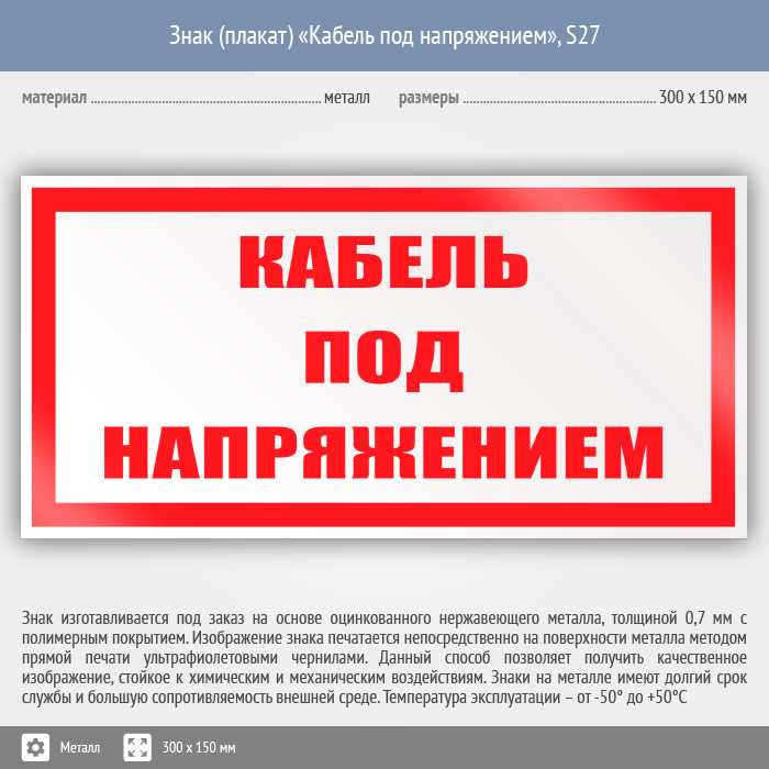 Знак (плакат) «Кабель под напряжением», S27 (металл, 300х150 мм) в Ачинске купить