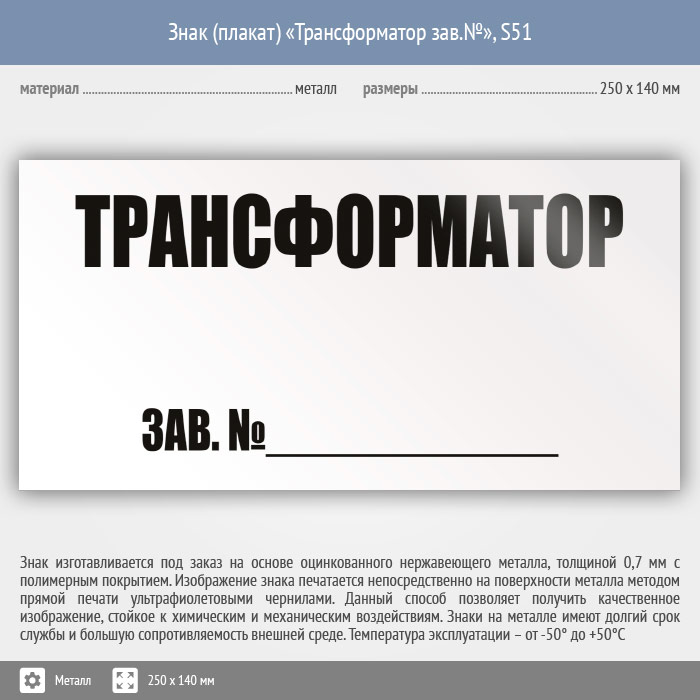 Знак (плакат) «Трансформатор зав.№», S51 (металл, 250х140 мм) в Ачинске купить
