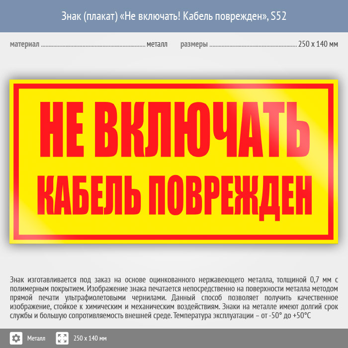 Знак (плакат) «Не включать! Кабель поврежден», S52 (металл, 250х140 мм) в Ачинске купить