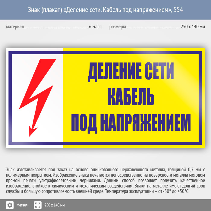 Знак (плакат) «Деление сети. Кабель под напряжением», S54 (металл, 250х140 мм) в Ачинске купить