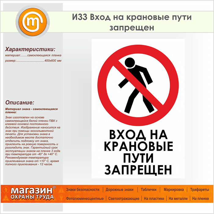 Знак «Вход на крановые пути запрещен», И33 (пленка, 400х600 мм) в Ачинске купить