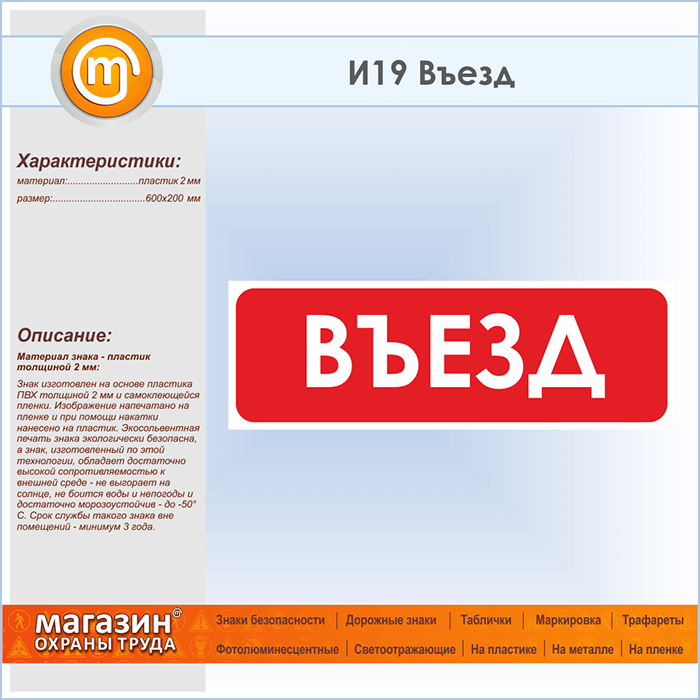 Знак «Въезд», И19 (пластик, 600х200 мм) в Ачинске купить