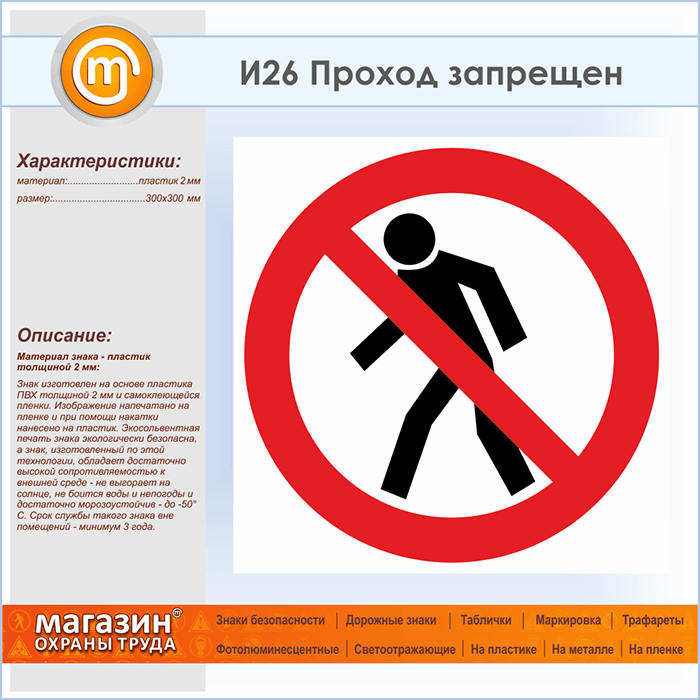 Знак «Проход запрещен», И26 (пластик, 300х300 мм) в Ачинске купить