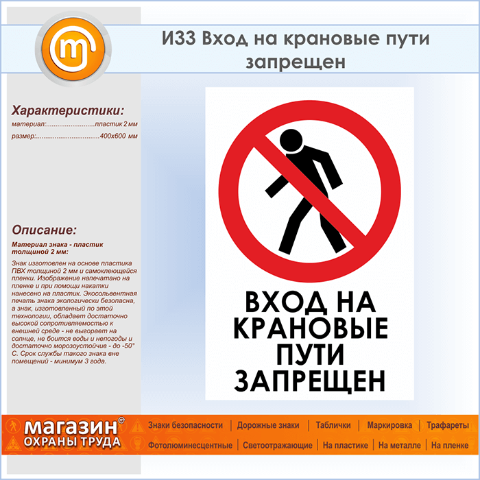 Знак «Вход на крановые пути запрещен», И33 (пластик, 400х600 мм) в Ачинске купить