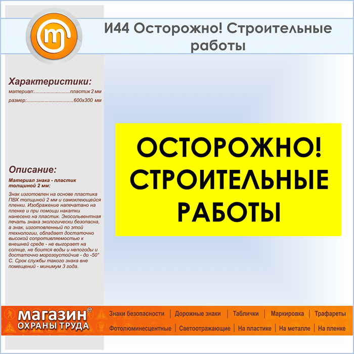 Знак «Осторожно! Строительные работы», И44 (пластик, 600х300 мм) в Ачинске купить