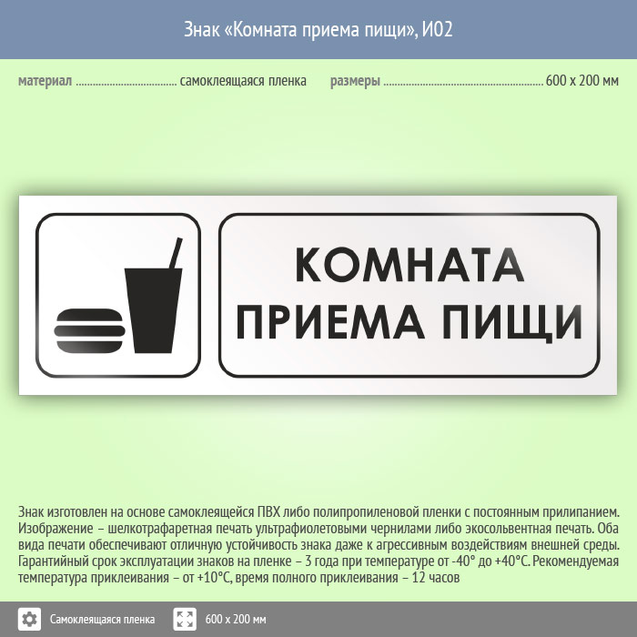 Знак «Комната приема пищи», И02 (пленка, 600х200 мм) в Ачинске купить
