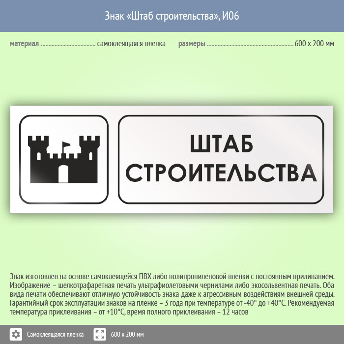 Знак «Штаб строительства», И06 (пленка, 600х200 мм) в Ачинске купить