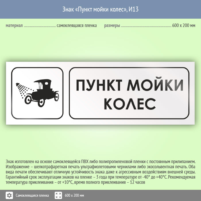 Знак «Пункт мойки колес», И13 (пленка, 600х200 мм) в Ачинске купить