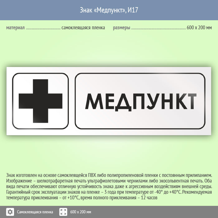 Знак «Медпункт», И17 (пленка, 600х200 мм) в Ачинске купить
